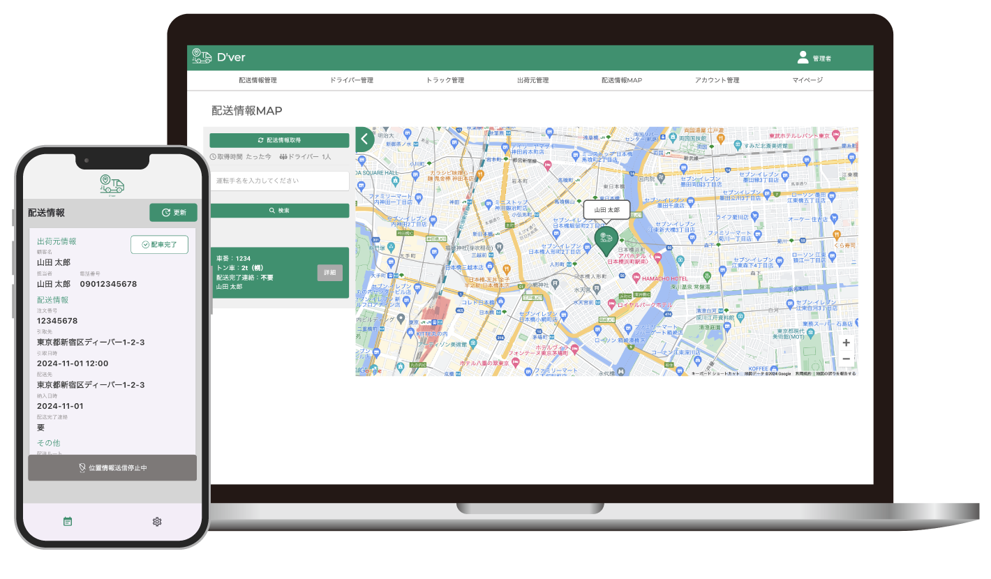 運送会社と荷主、両方の視点から物流をサポート About the D’ver システムについて 「運ぶ」をもっとスムーズに、もっと効率的に物流は荷物を運んだらそれで終わりという単純なものではありません。荷主から届け先までの橋渡しをする。それが運送会社、ひいては物流の仕事です。運送管理の効率化、業務改革には荷主の視点も必要不可欠です。そんなありそうでなかった運送管理システムにより業界に新たな価値を創造していきます。 D’verは運送業務を運送会社と荷主 二つの視点で管理ができるツールです 導入をご検討の業者様はお問い合わせフォームよりご連絡ください。 担当者よりご連絡させていただきます。 お問い合わせはこちら これからの物流の案件管理は 運送会社も荷主もドライバーもこれひとつで 主な機能 ・運送案件管理・トラック位置情報MAP管理・出荷元(顧客)管理・ドライバー、トラック管理・社内アカウント管理・自担当の運送情報管理(ドライバーがスマホアプリから管理) Plan ご提供プラン LIGHT ライトプラン お試しで導入してみたい運送業者様向け トラック登録台数30台まで 14,900円/月 STANDARD スタンダードプラン 本格運用をご検討の運送業者様向け トラック登録台数100台まで 19,900円/月 ADVANCED アドバンスドプラン 大規模運送業者様向け トラック登録台数無制限 24,900円/月 ※ 荷主業者様は無料でご利用いただけます 導入をご検討の業者様はお問い合わせフォームよりご連絡ください。 担当者よりご連絡させていただきます。 お問い合わせはこちら 循環する未来へ、つなぐ力を